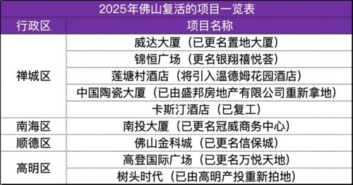 事实上,除了南国大酒店外,佛山2025年也有至少9个项目陆续复活,它们中部分也于日前传来了新的动静。
