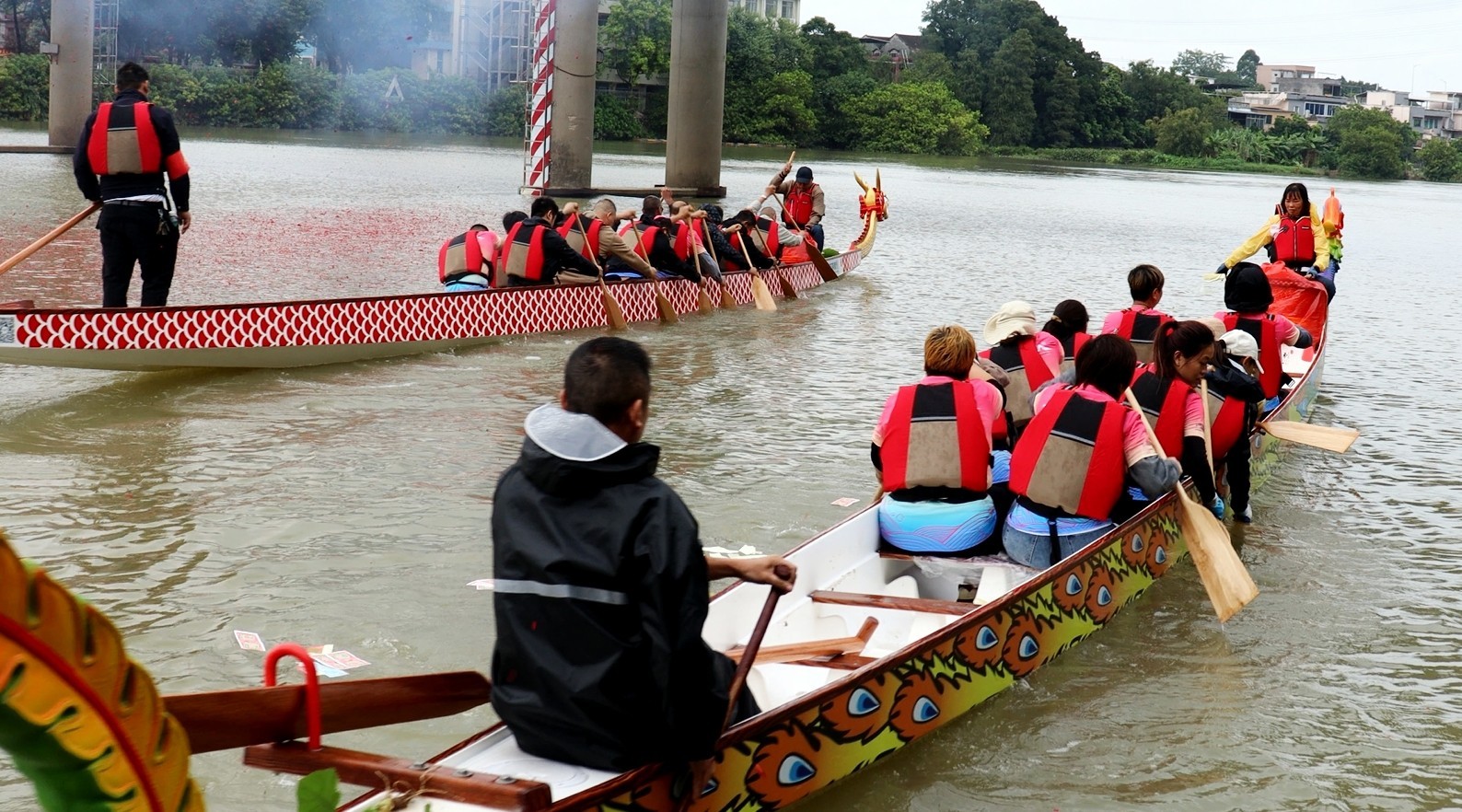 下午,点睛开光仪式正式开始,萧岗龙舟、凤舟并排于岸边。由萧岗联社与广州农商行白云支行代表共同为龙头、凤头点睛,以传统方式赋予龙舟“生命”,并以柚子叶洒净水,寓意驱邪纳吉、舟行顺利。